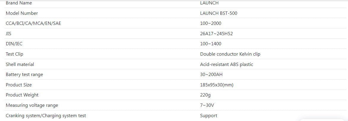 Launch BST-500 Car Battery Tester Specification: