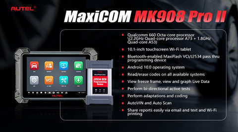 Autel MaxiCOM MK908P II is a 10.1-inch touchscreen advanced diagnostics tablet powered by an Octa-core processor with 128GB of storage memory and runs on Android 10. The MK908P II can read/erase codes on all available systems, perform bi-directional active tests, view freeze frames, view and graph live data, and perform adaptations and coding on U.S., Asian and European vehicles, 1996 and newer.