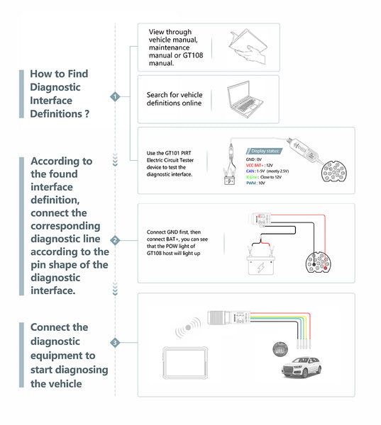 Note: If you cannot find the definition for your own vehicle diagnostic interface, you can first find out the power supply of the diagnostic interface. First use the black battery clip on the battery connection cable to connect the negative pole of the battery, and then use the BAT+ line to connect to the diagnostic interface to find the power supply. You can also use a multimeter to find the diagnostic interface power supply. The definition of the diagnostic interface can also be judged by the GT101 Pirt Electric Circuit Tester device.